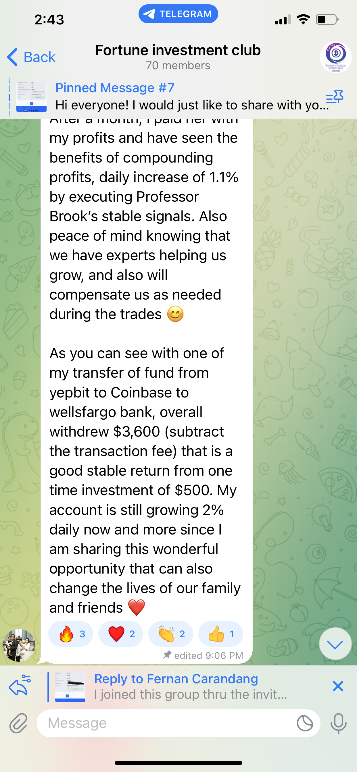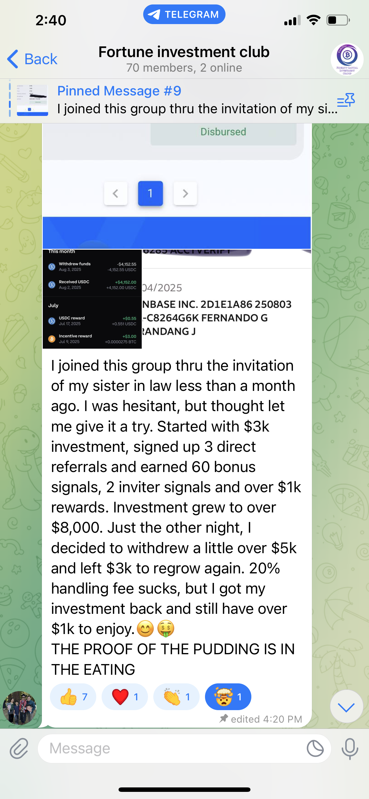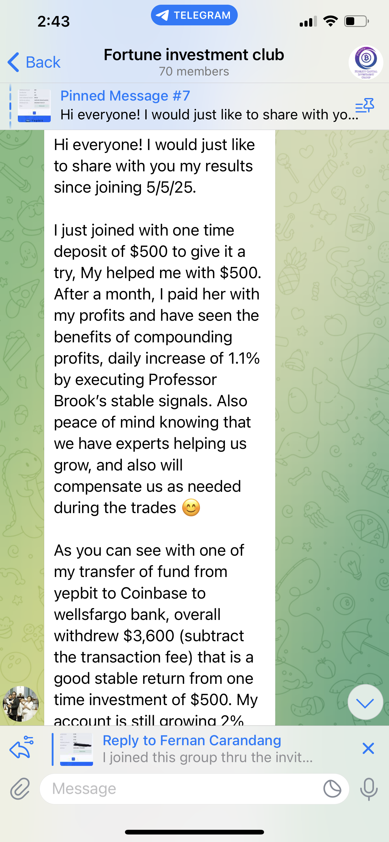 I was invited to join FCIG in the middle of May 2025 by a family friend. I started with just $500 and to instill confidence in us, our family friend offer to lend us an additional $500 for a total initial investment of $1,000.00. After engaging with Professor Brook, I’ve learned so much regarding the crypto investment world which I never considered looking into before and didn’t realized I was missing out on opportunities! I have since withdrew $500 and repaid our family friend and made withdrawals totaling $1,310.00 and my account has grown to $2,700.00. With having four permanent signals, it’s now compounding 2% daily!